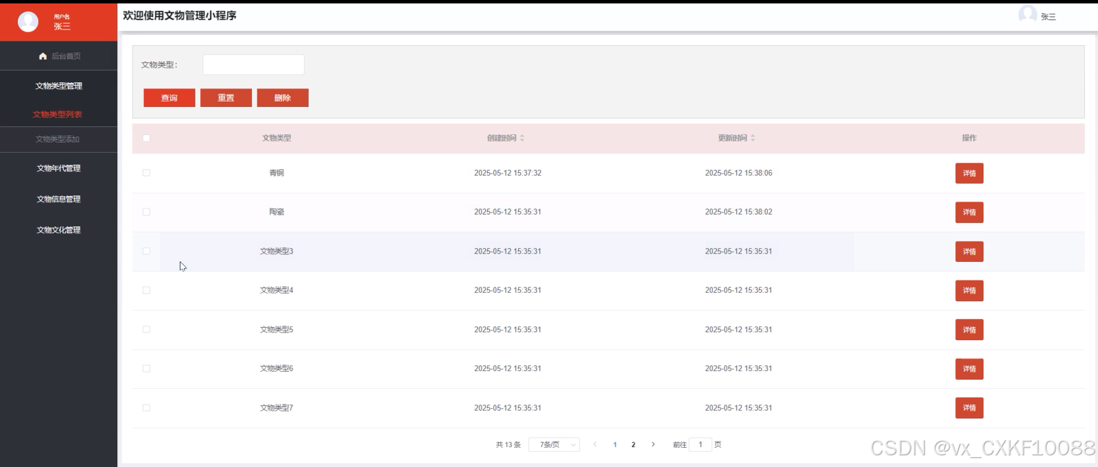 文物类型管理:支持对文物分类信息进行增删改查操作,便于统一规范文物归类,提升信息管理的条理性和检索效率。