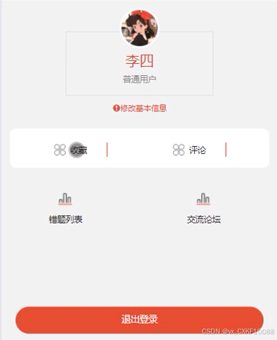 我的:个人中心模块,用户可修改基本信息、查看收藏内容、评论记录、错题列表以及发布的论坛信息,实现一站式账户管理。