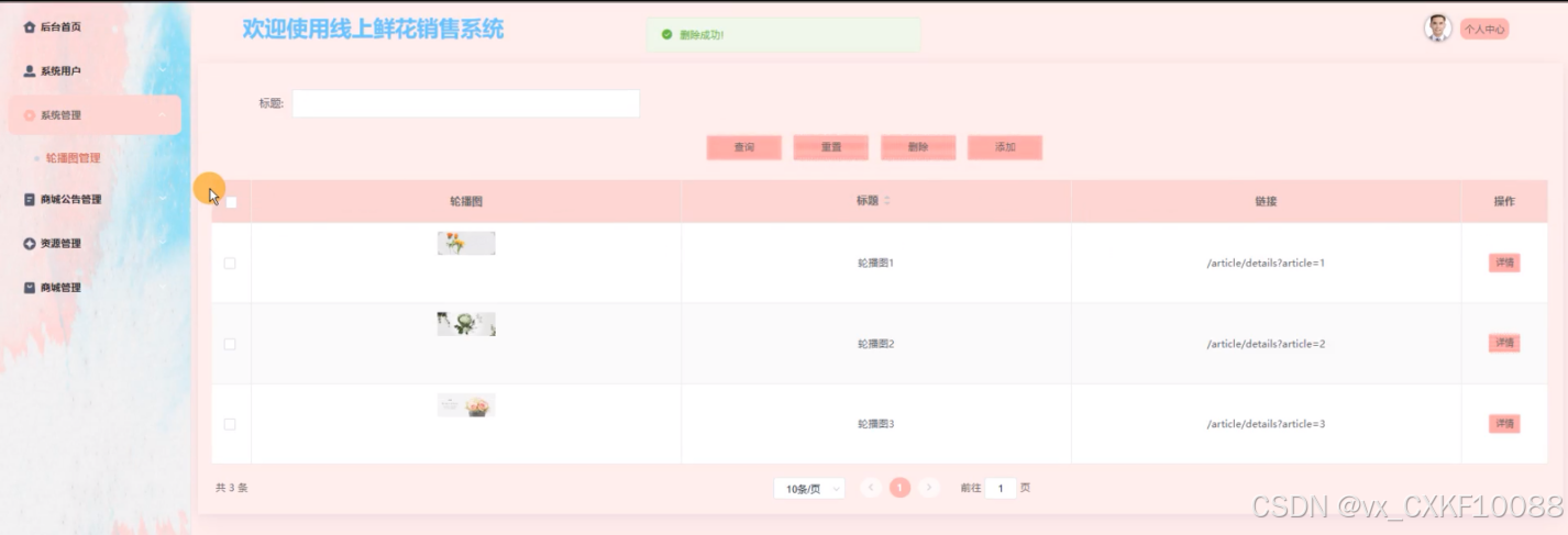 - 系统管理:上传和管理系统首页的轮播图,用于展示重要信息、促销活动或新品推荐。