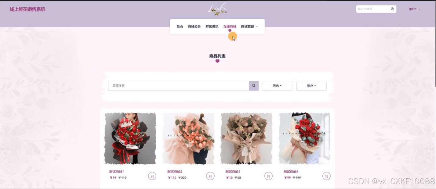 - 在线商城:在线商城是用户浏览、选购鲜花的主要区域。用户可以使用局部搜索或筛选等功能,快速找到心仪的鲜花产品。商城内设有收藏、点赞、加入购物车、立即购买、积分兑换等功能,方便用户进行购物决策。