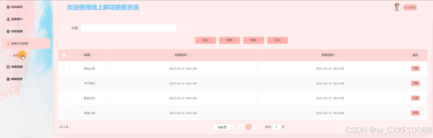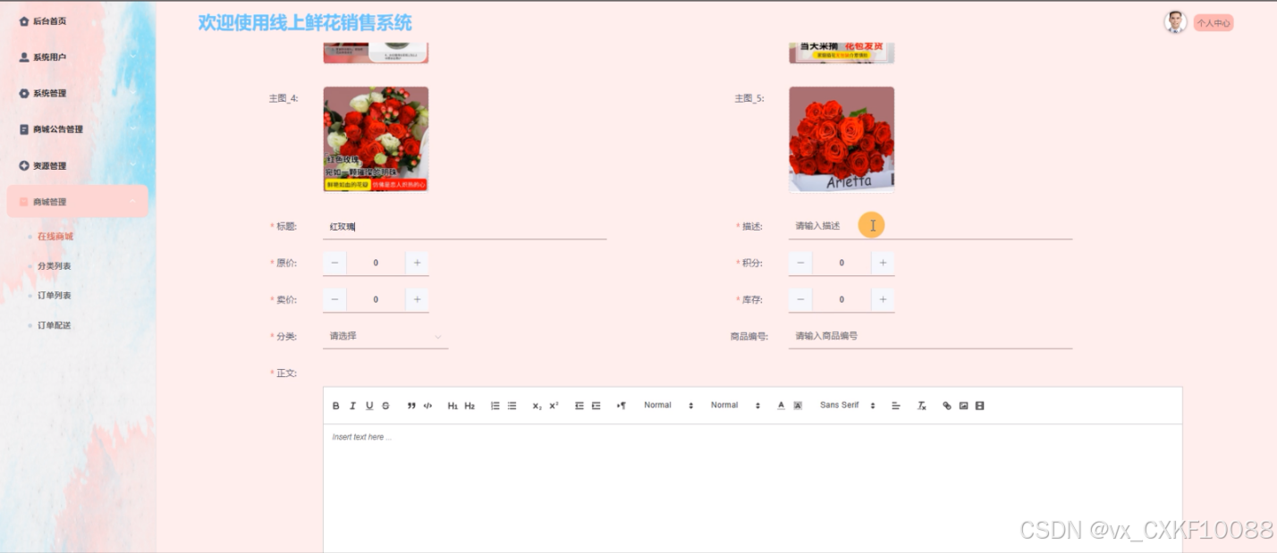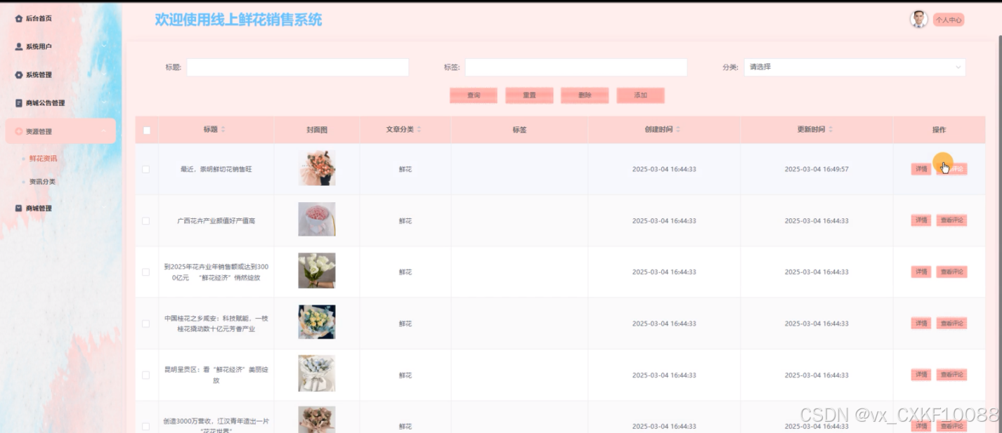 - 资源管理:资源管理功能包括鲜花资讯和资讯分类的管理。管理员可以添加、编辑或删除鲜花相关的新闻资讯,并对资讯进行分类管理。这有助于丰富商城的内容,提升用户体验。