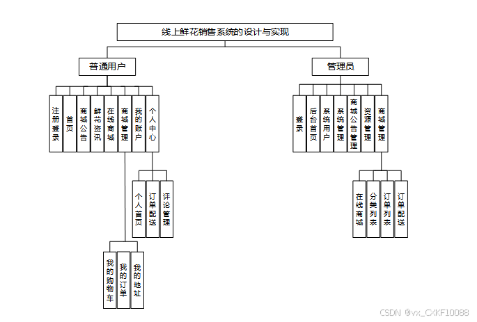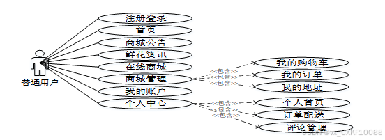 按照线上鲜花销售系统的角色,主要包括普通用户和管理员这两大用户功能模块,各用户功能模块的具体功能说明如下。