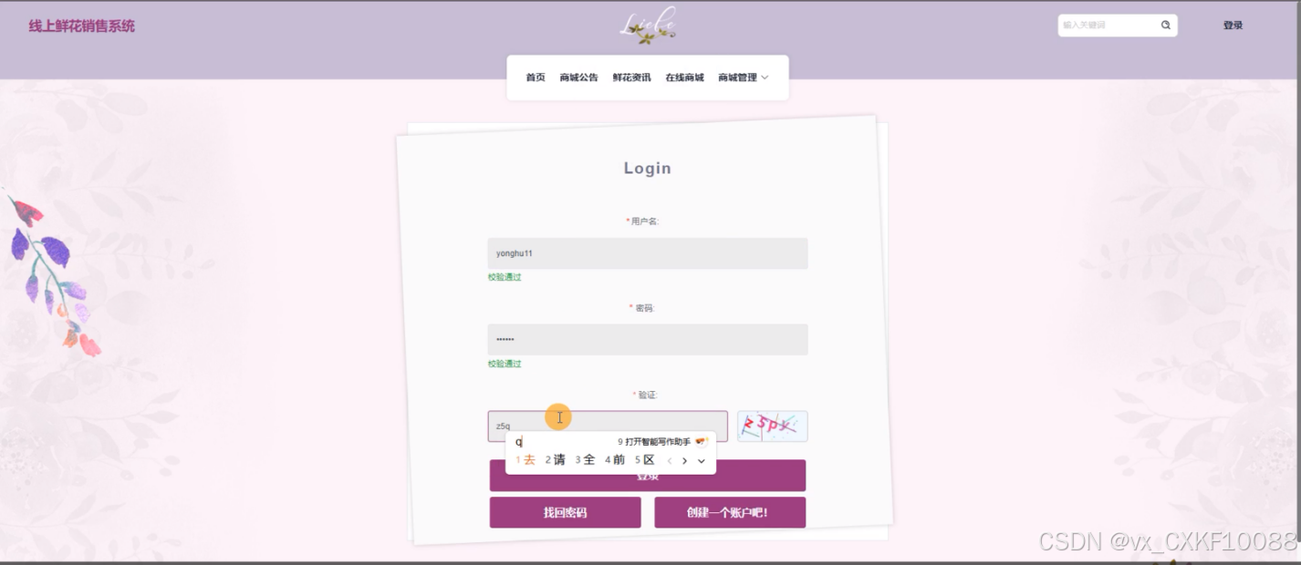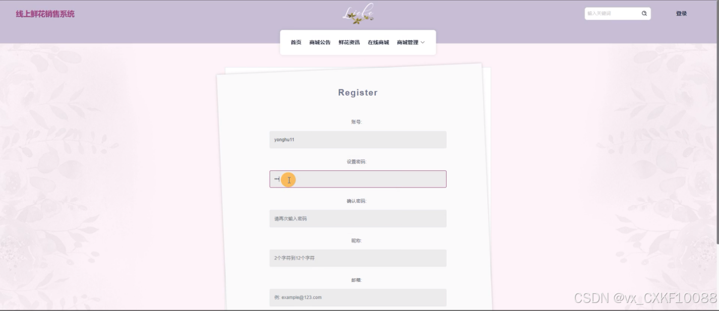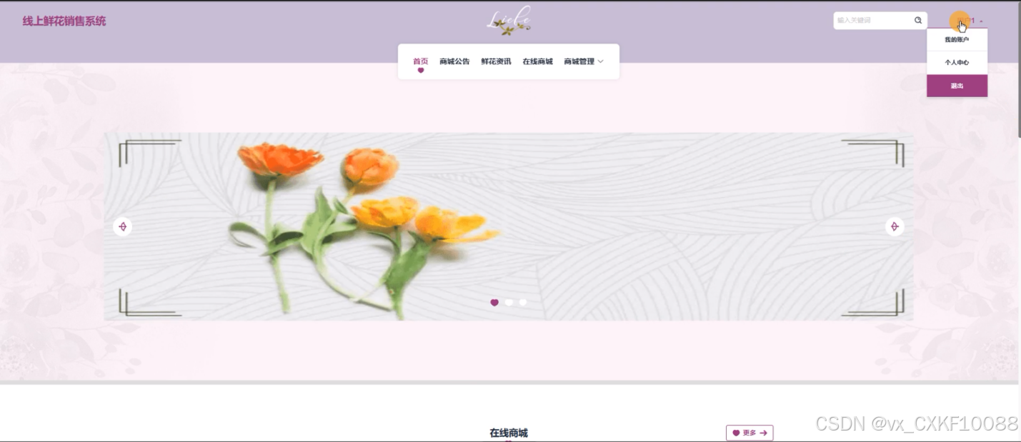 首页界面是用户访问该系统的入口页面,它展示系统的主要功能和特色。用户可以查看首页展示的轮播图、在线商城、鲜花资讯等信息。在线商城界面,系统会根据用户的购买记录进行优先推荐同类商品。其界面展示如下图4-3所示。