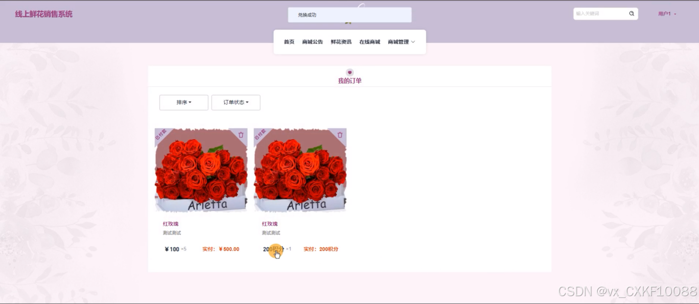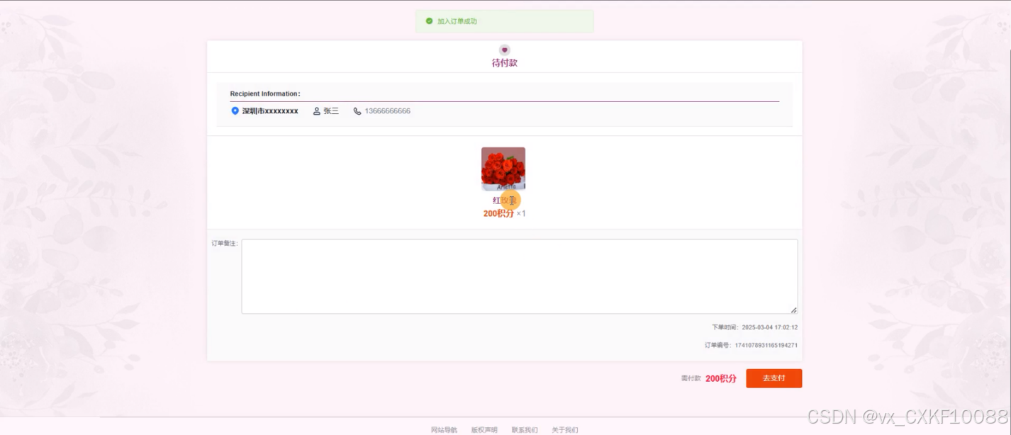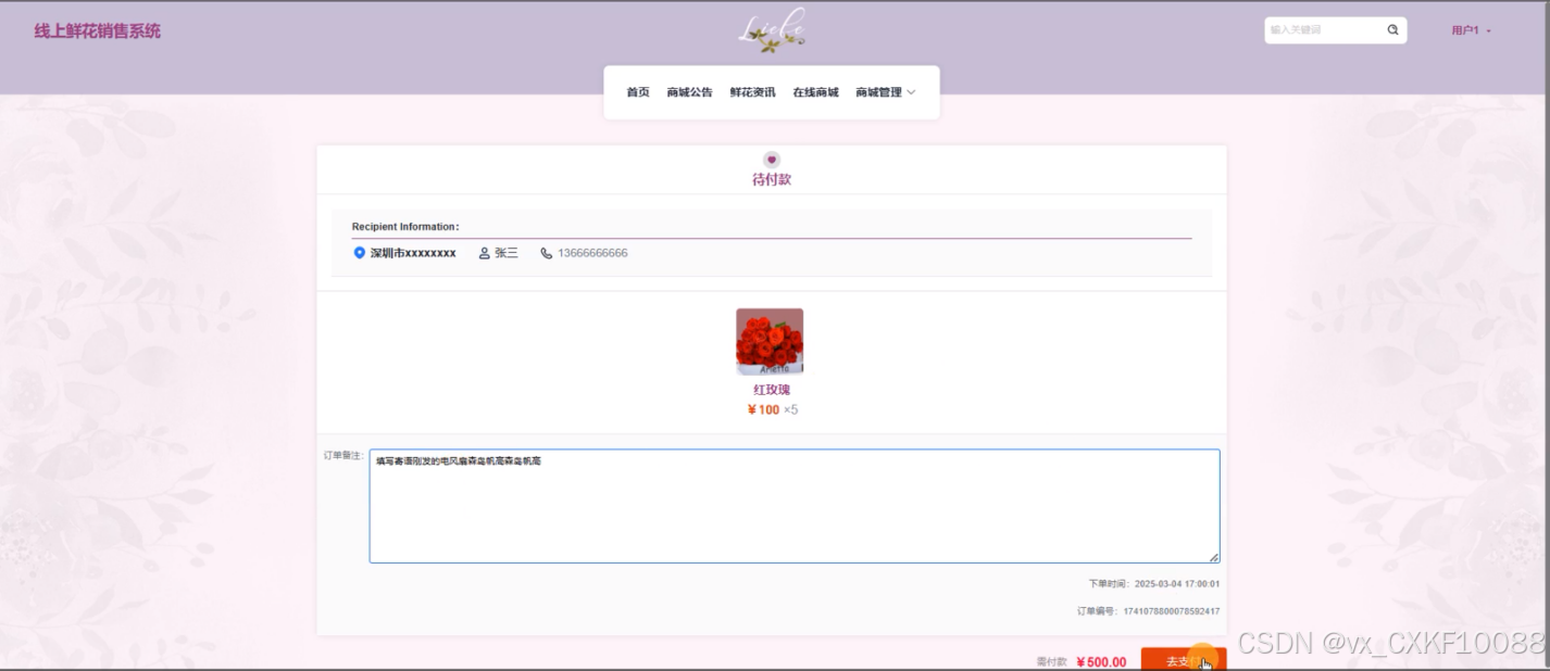 | 用户购买商品 | 测试普通用户购买鲜花商品 |