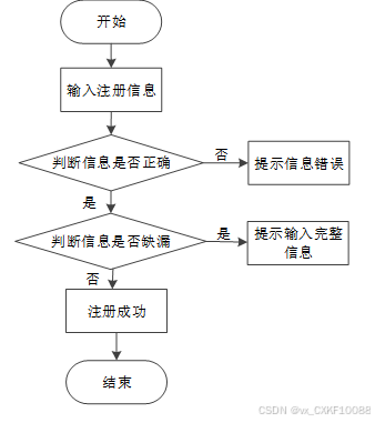 未有账号的用户可进入注册界面进行注册操作,填写注册表格,包括用户名、密码、姓名等必要信息。后台系统验证并保存用户提交的信息。分配唯一用户标识符。注册成功后,用户可以使用账号密码进行登录。用户注册流程图如下图2-3所示。