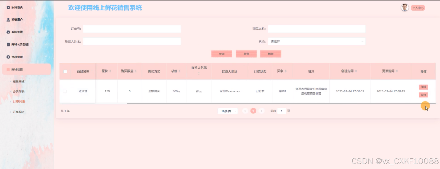 本系统利用了django框架、python语言、MySQL数据库等现代技术,构建了一个高效、稳定且功能丰富的线上鲜花销售系统。该系统包含商城公告、鲜花资讯等模块;商城管理模块包括在线商城展示、分类列表、订单列表、订单配送管理。