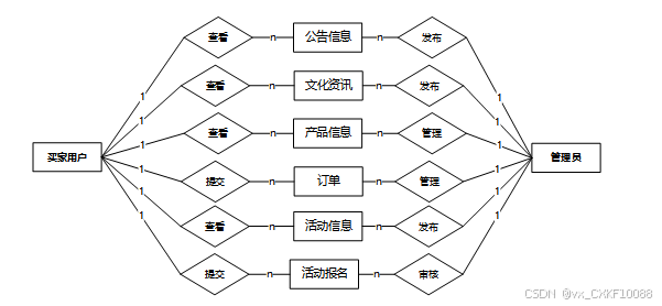 This system is mainly divided into two roles: buyer and administrator. Buyer users can browse products, view announcements and cultural information, manage shopping carts and orders, use coupons, and participate in activities through the homepage. The personal center provides convenient functions such as order delivery, collection, and comment management. The administrator backend provides a series of operations such as product sales statistics, user management, event management, announcement and cultural information editing, and order management. The system will support key functions such as adding, deleting, modifying, and querying product information, tracking order status, event registration and management, ensuring smooth interaction between buyers and sellers.