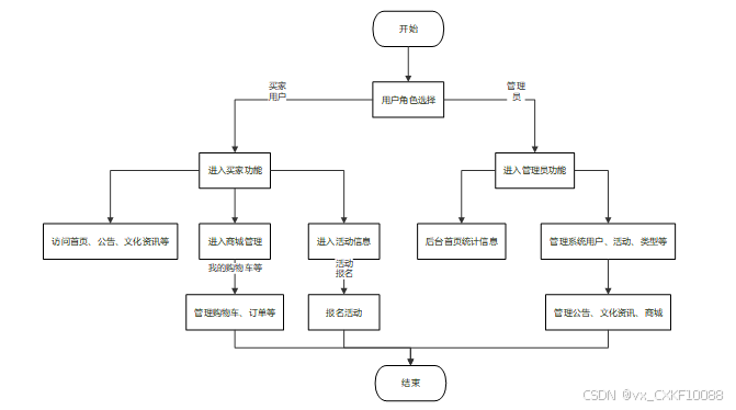 本系统主要分为买家和管理员两大角色。买家用户可以通过首页浏览商品、查看公告与文化资讯、管理购物车与订单、使用优惠券及参与活动。个人中心提供订单配送、收藏与评论管理等便捷功能。管理员后台则提供商品销售统计、用户管理、活动管理、公告与文化资讯编辑、订单管理等一系列操作。系统将支持商品信息的增删改查、订单状态的跟踪、活动报名与管理等关键功能,确保买卖双方的顺畅互动。