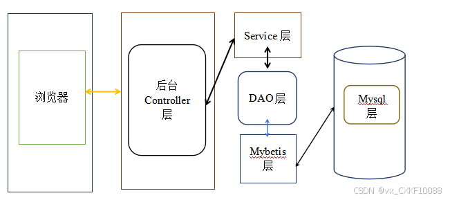 具体交互流程为:浏览器中执行具体操作,操作命令将生成一个do方法。该方法使得浏览器能够访问后台中的Controller层,Controller层由于业务上的需要执行进而访问Service层。Service层收到指令后将会去调用内部DAO层的接口。接口将会和MyBatis层下的一个SQL语句相对接。对接好之后进而访问MySql数据库。更新底层数据,然后将数据同步回MyBatis层,同步变化后的数据将通过DAO层接口,Service层和后台Controller层,直观反映到浏览器页面上。
