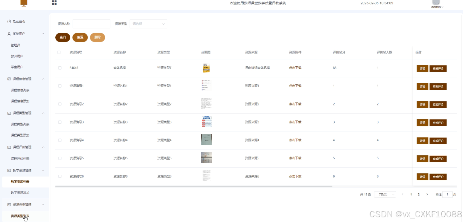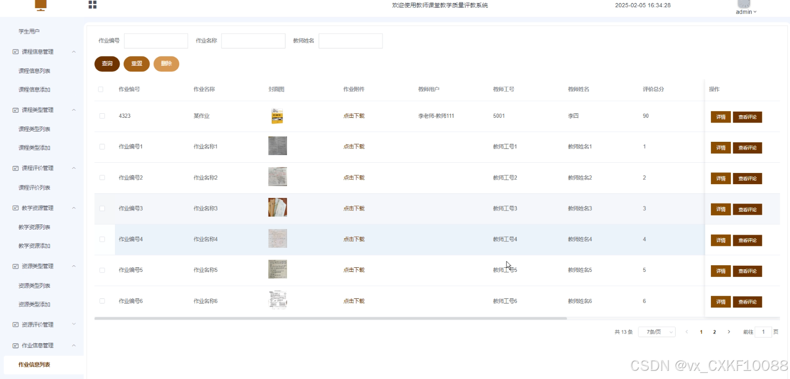 本系统旨在满足教育领域对教学评价的现代化需求。它能够快速收集和处理学生对教师课堂教学质量的评价信息,提供及时、准确的反馈。系统支持多种评价方式,涵盖课程评价、教学资源评价、作业评价等多个维度,为教师提供全面的教学质量反馈。同时,系统为教师和管理员提供便捷的管理功能,方便教师进行自我评价和同行评价,管理员可高效管理课程、教学资源、作业和问题反馈等信息。这不仅提升了教学评价的效率和准确性,还促进了教学质量的持续改进,推动教育信息化进程,为教育管理者提供科学决策依据,具有重要的现实意义。
