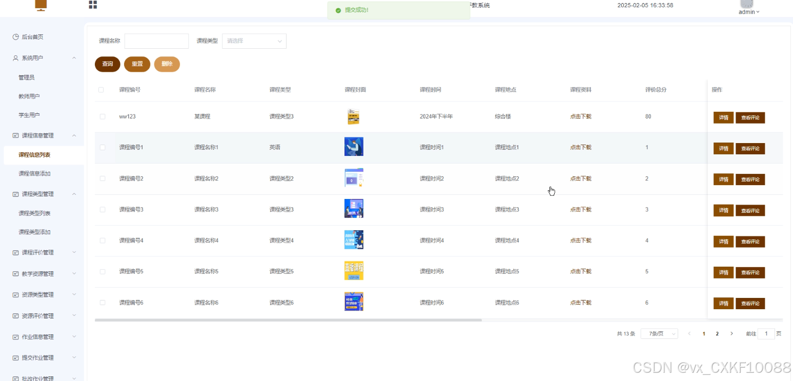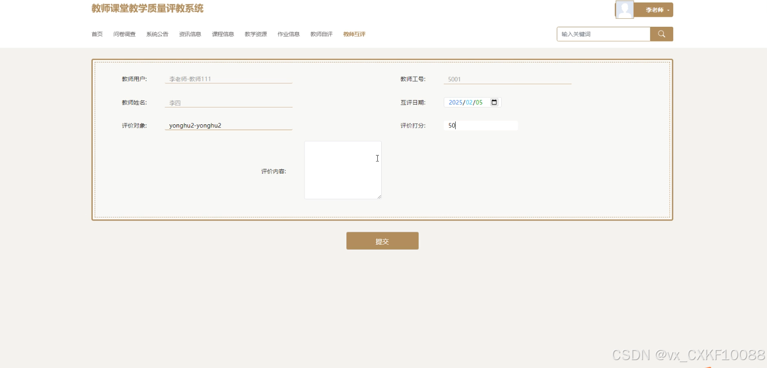 学生登录系统后,进入课程信息页面,选择需要评价的课程。系统展示课程相关信息及评价指标,学生根据教学内容、教学方法、教师态度等方面进行评分并填写文字评价。点击“提交”按钮后,系统将评价信息存储至数据库,同时更新课程评价统计结果,完成课程评价功能。如图3-4所示。
