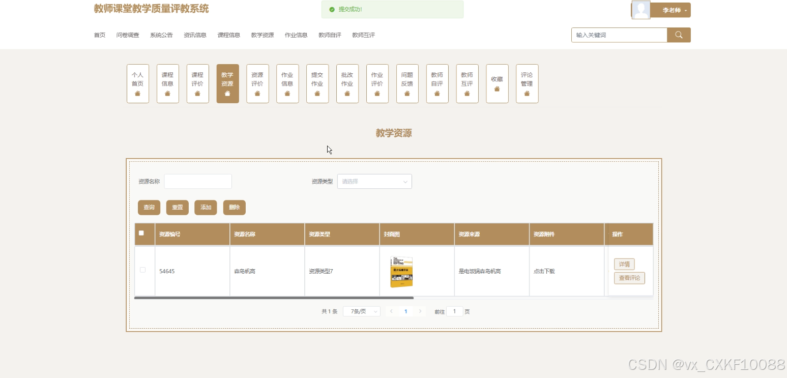 | 教师教学资源管理功能测试 | 教师登录系统,进入教学资源页面,选择一个资源并删除,确认删除 | 系统提示删除成功,被删除资源不再出现在资源列表中 | 与预期结果一致 |