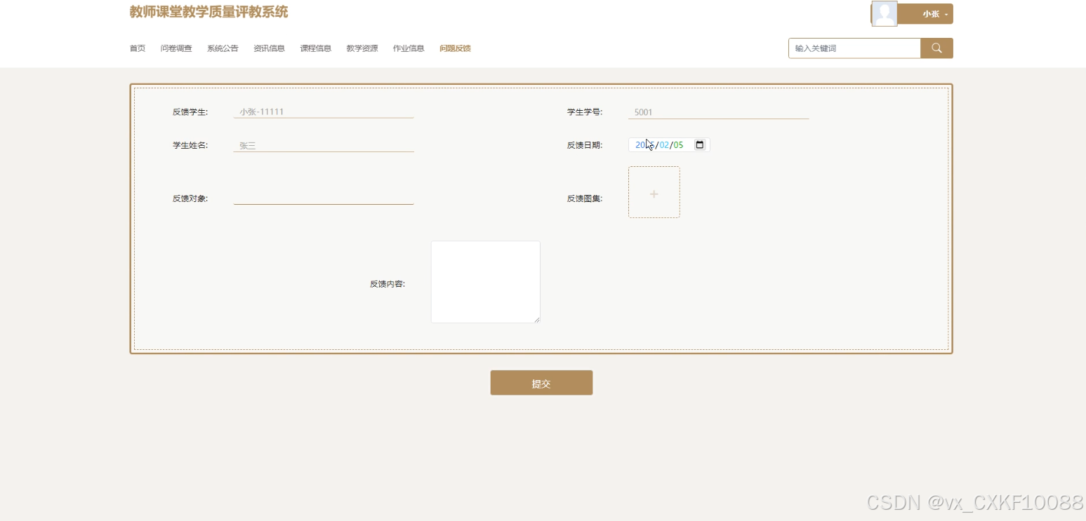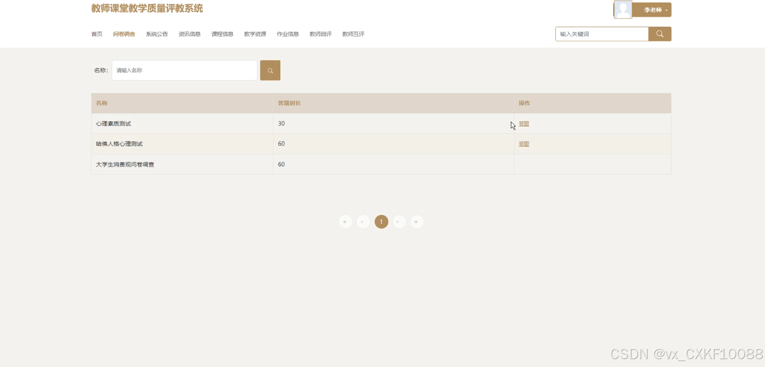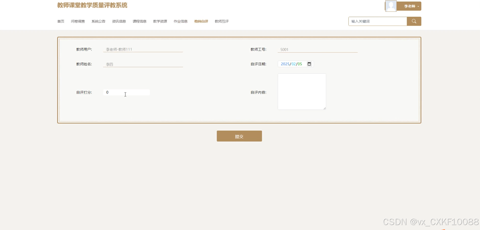 随着信息技术的快速发展,传统教学评价模式主要依赖纸质问卷和人工统计,效率低且数据易出错。为解决这些问题,设计基于SSM框架的教师课堂教学质量评教系统。系统前端采用SpringBoot技术,后端基于SSM框架,数据库选用MySQL。学生可进行问卷调查答题与查看、课程评价与收藏、教学资源查询与评价、作业信息查询与提交等操作;教师可参与问卷调查、管理课程信息、教学资源、进行自评与互评;管理员负责课程信息、教学资源、作业信息、问题反馈及问卷调查的管理,支持数据查询、删除、重置、审核等功能。