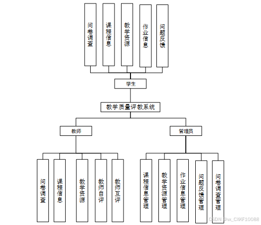 系统为教师课堂教学质量评教系统,主要功能涵盖学生、教师和管理员三大角色模块。学生可进行问卷调查答题与查看,对课程进行评价和收藏,查询教学资源并进行评价、收藏,查看作业信息、下载附件、提交作业、收藏及评论,反馈问题。教师可参与问卷调查答题与查看,管理课程信息和教学资源,进行教师自评和互评。管理员负责课程信息、教学资源、作业信息和问题反馈的管理,包括数据的删查、重置、查看评论、下载资料以及问卷调查的管理。