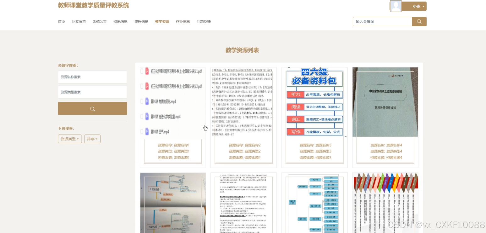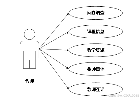 教师功能包括问卷调查,课程信息,教学资源,教师自评与教师互评。