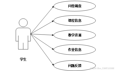 学生功能包括问卷调查答题与查看,课程信息评价与收藏,教学资源查询、评价与收藏,作业信息查询、下载附件、提交作业、收藏与评论,以及问题反馈。