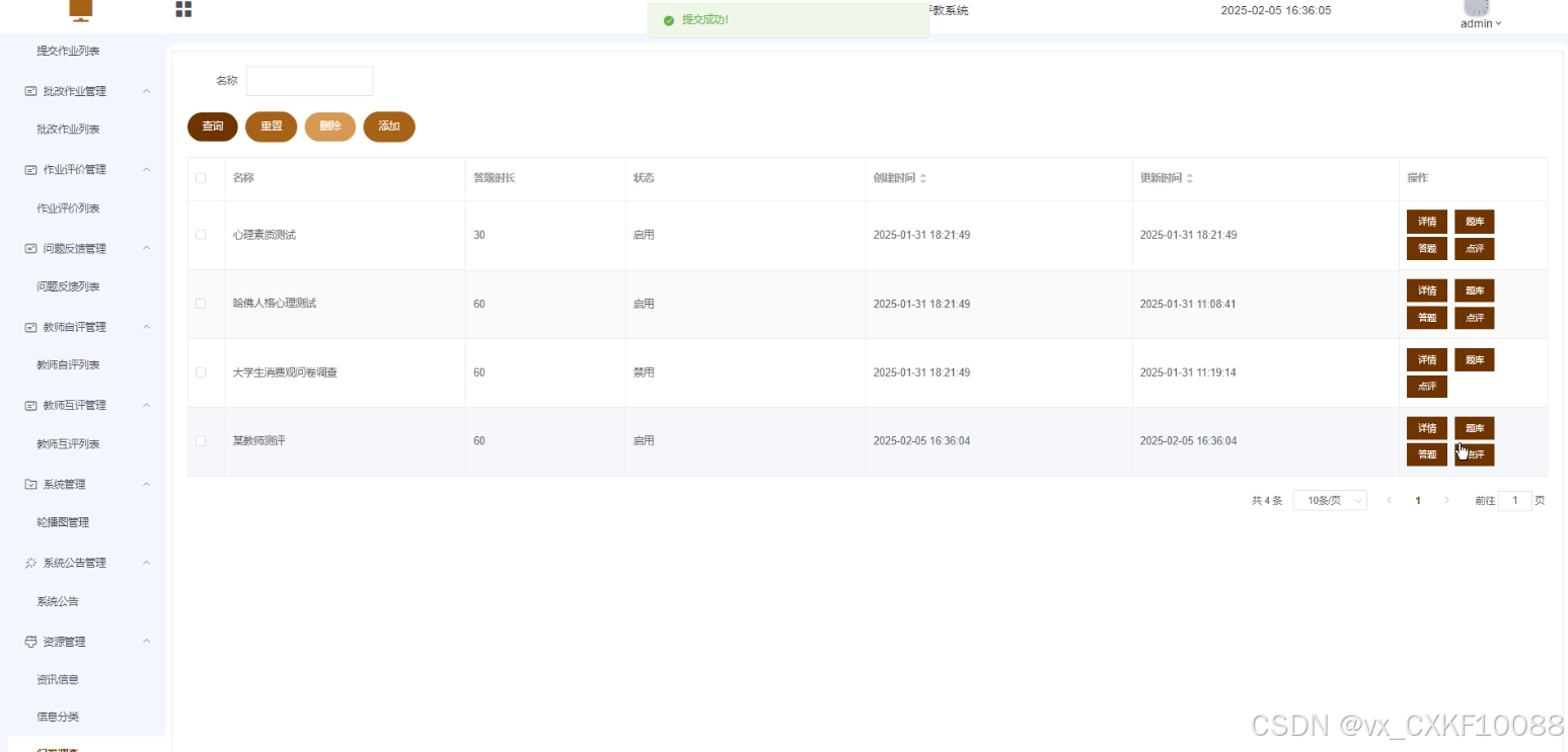 管理员可重置问卷状态,重新设置问卷信息。管理员可管理题库,添加或删除题目。管理员可对问卷进行点评,帮助学生理解问卷内容。