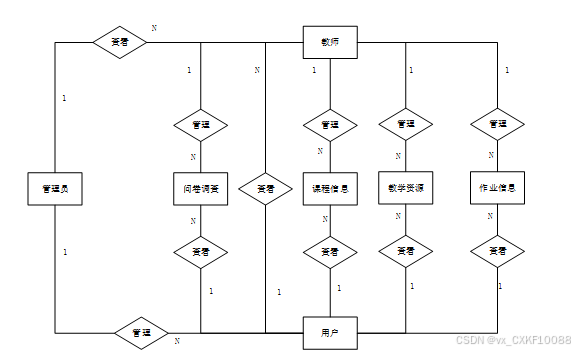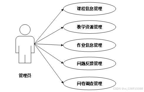 管理员功能包括课程信息管理,教学资源管理,作业信息管理,问题反馈管理,问卷调查管理。