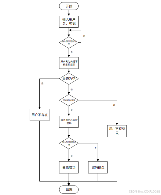 用户输入用户名和密码后,系统先检查输入是否为空,再验证用户名是否存在,若存在则通过用户名获取密码并校验。若密码正确则登录成功,否则提示密码错误。若用户名不存在或无法登录,提示用户操作无效。如图4-2所示。