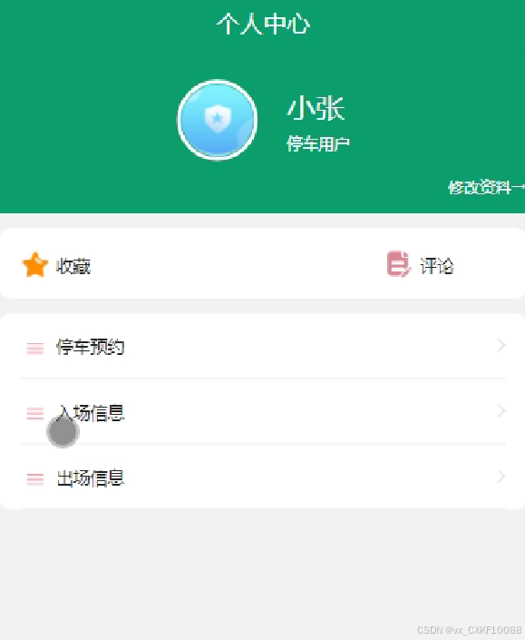 停车用户点击进入个人中心可以实现以下功能:停车预约、入场信息、出场信息(支付功能)、收藏、评论。个人中心界面如图5-5所示。