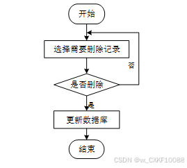用户选择需要删除的记录后,系统判断是否确认删除。若未确认,返回选择环节;若确认删除,则更新数据库,删除对应记录,完成操作后流程结束。删除信息流程图如图4-5所示。