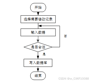 用户首先选择需要修改的记录,输入修改后的数据,系统判断输入数据是否合法。若数据不合法,提示重新输入;若数据合法,则将修改后的数据写入数据库,完成操作后流程结束。修改信息流程图如图4-4所示。