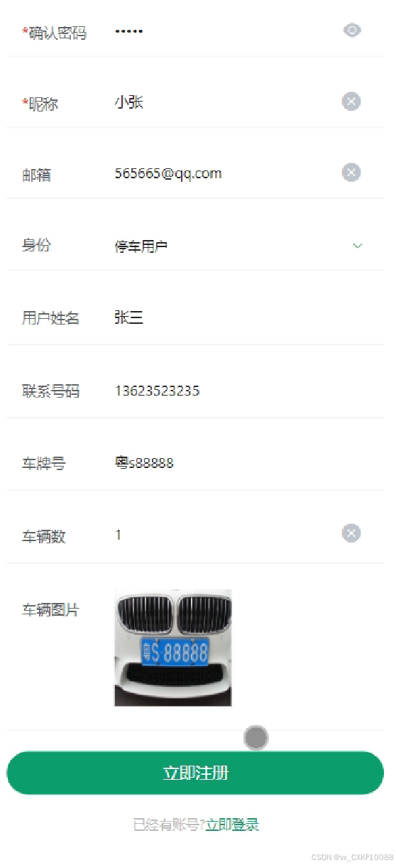 停车用户注册时,系统要求用户提供必要的信息,例如用户名、密码、电子邮件地址等。这些信息通常由用户在注册表单中输入,并通过前端验证确保格式的正确性。注册过程完成后,系统会为新用户创建一个账户。这包括分配一个唯一的用户ID和设置初始的权限或者角色。用户注册界面如图5-1所示。
