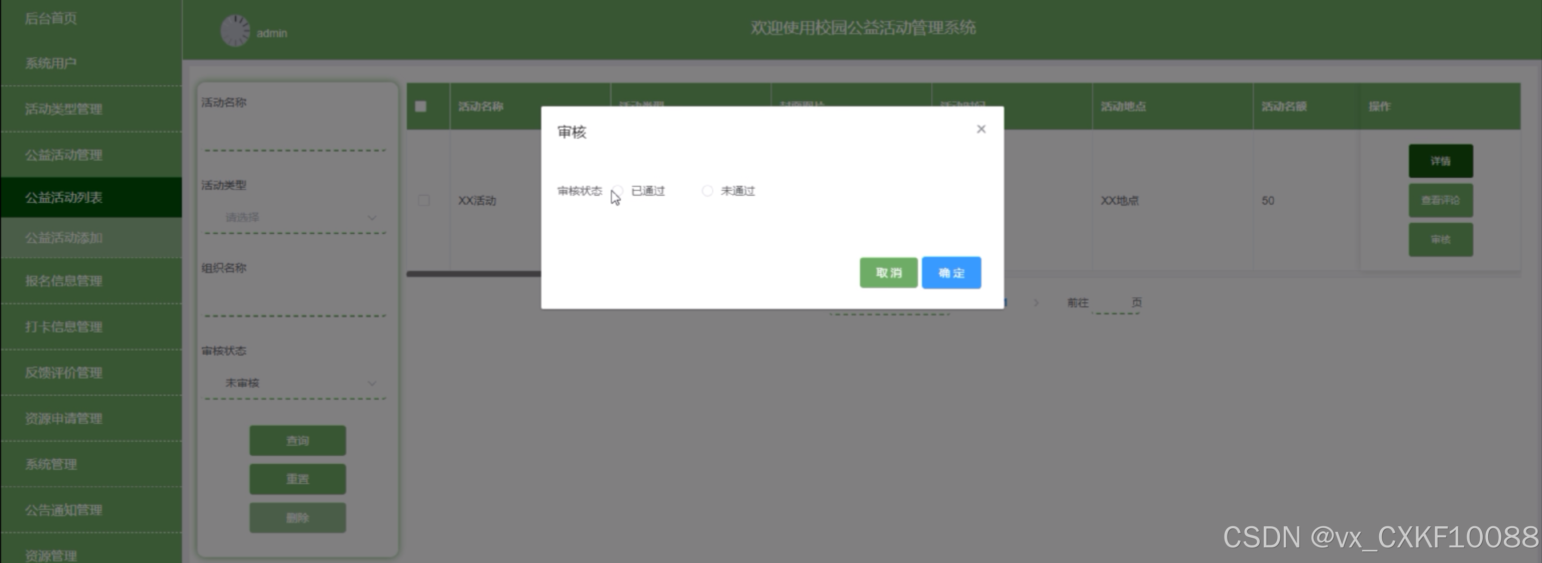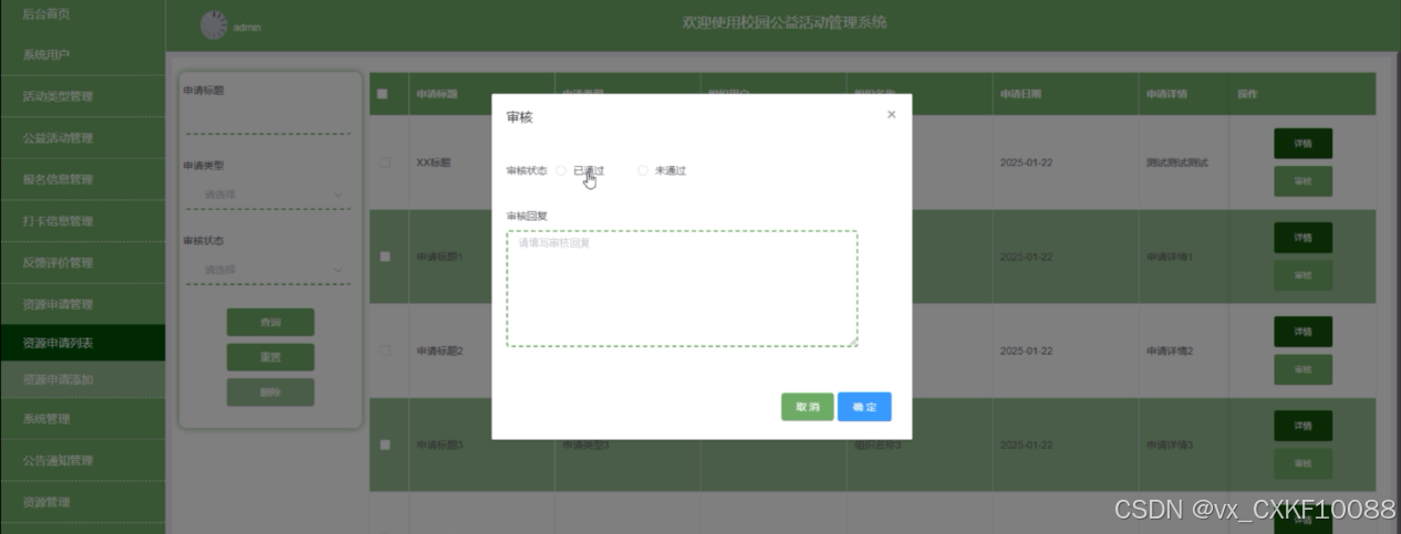 公益活动管理:管理员点击可查看公益活动列表,同时可对组织添加的公益活动进行审核回复。界面如下图所示。
