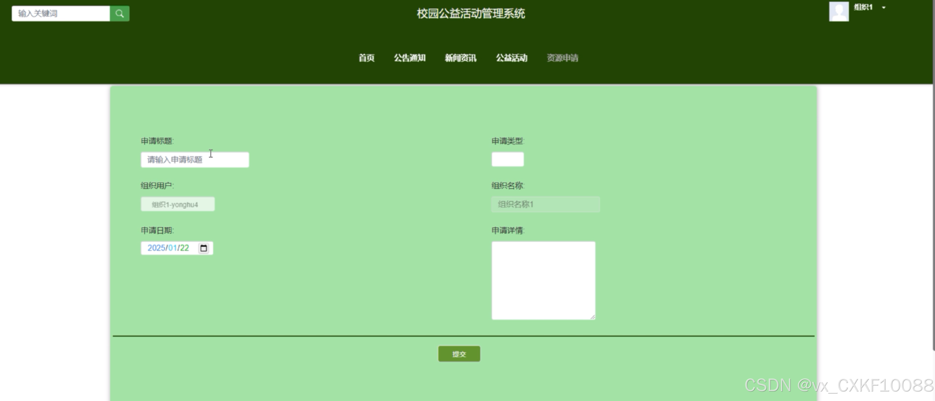 资源申请:组织用户点击可添加资源申请信息,包括申请标题、申请类型、组织用户、组织名称、申请日期和申请详情。界面如下图所示。