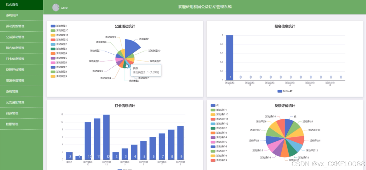 后台首页:管理员点击可查看公益活动、报名信息、打卡信息和反馈评价数据统计图。界面如下图所示。
