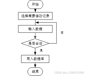 用户首先选择需要修改的记录,输入修改后的数据,系统判断输入数据是否合法。若数据不合法,提示重新输入;若数据合法,则将修改后的数据写入数据库,完成操作后流程结束。修改信息流程图如图4-4所示。