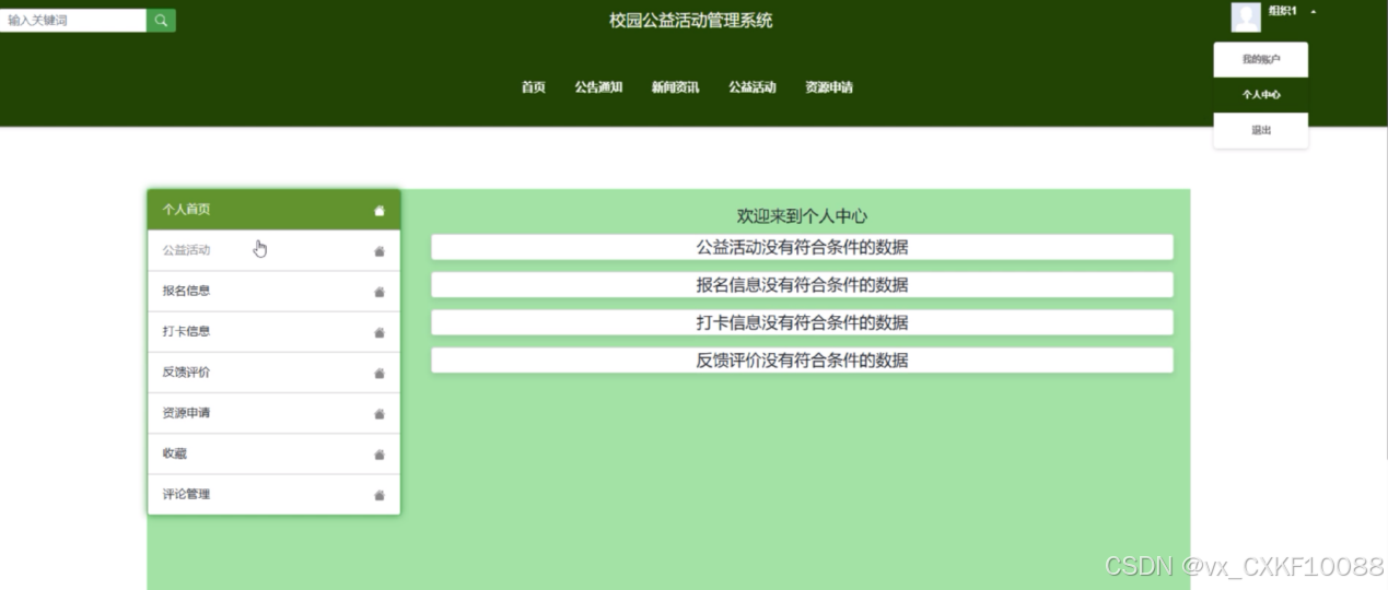 个人中心:个人中心包含多个功能模块,如个人首页、公益活动、报名信息、打卡信息、反馈评价、资源申请、收藏和评论管理。点击进入“公益活动”可对志愿用户的报名信息进行审核,同时可点击“添加‘按钮可添加新的公益信息,包括活动名称、活动类型、封面图片、活动时间、活动地点、活动名额、组织用户、组织名称、时长单位、活动时长和活动详情。点击进入其他功能模块可进行查看、管理和删除操作。界面如下图所示。