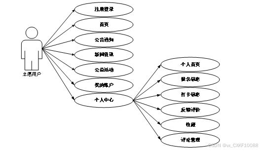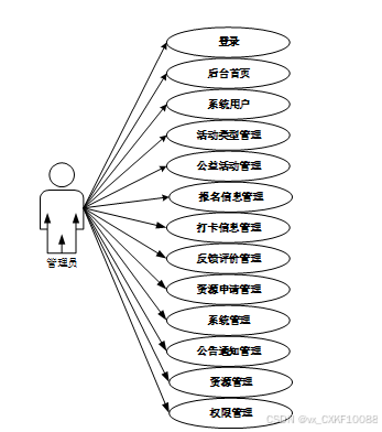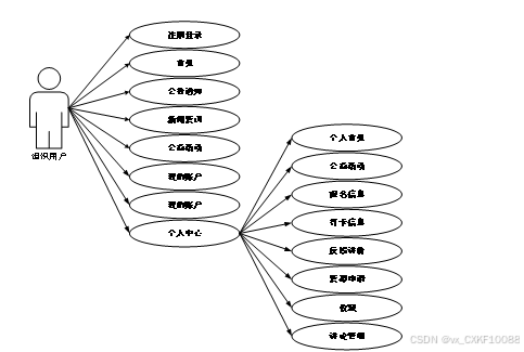 UML(统一建模语言)用例图是需求分析阶段常用的工具,通过直观的图形方式表示系统的功能需求和参与者。每个用例图包含一系列用例,即系统能够执行的特定功能,以及与之交互的参与者。本文将对系统按照角色模块进行需求分析。