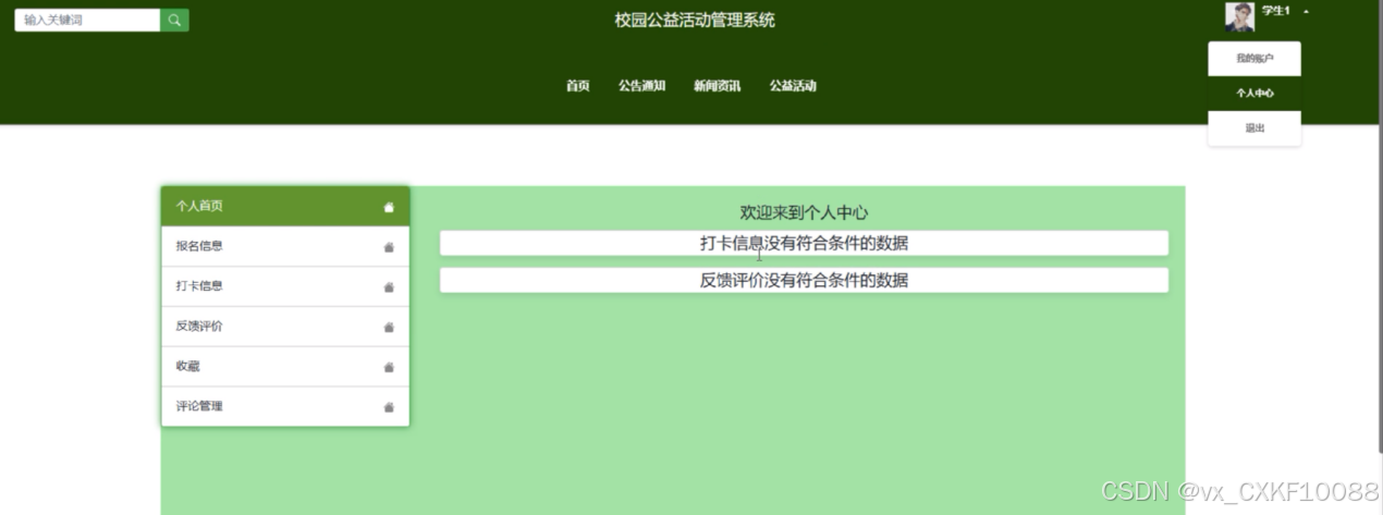 个人中心:个人中心包含多个功能模块,如个人首页、报名信息、打卡信息、反馈评价、收藏和评论管理。点击进入“报名信息”可查看报名信息审核状态,在审核通过后,可点击”打卡“按钮填写打卡信息;可点击反馈评价填写反馈信息;同时可对历史收藏信息和评论信息进行查看或删除。界面如下图所示。