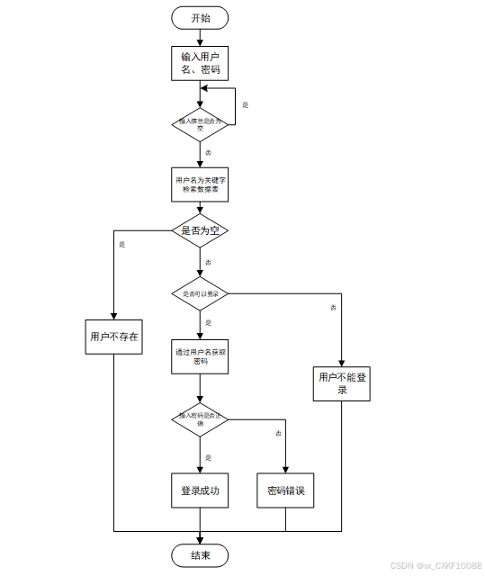 用户输入用户名和密码后,系统先检查输入是否为空,再验证用户名是否存在,若存在则通过用户名获取密码并校验。若密码正确则登录成功,否则提示密码错误。若用户名不存在或无法登录,提示用户操作无效。如图4-2所示。
