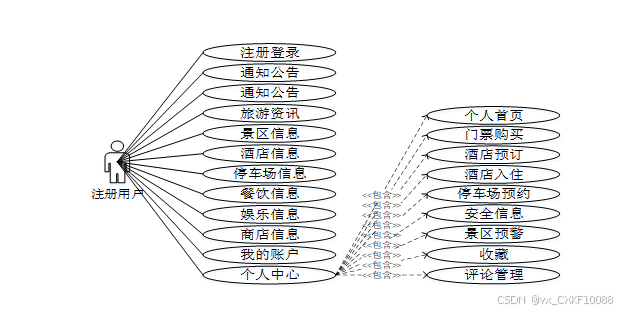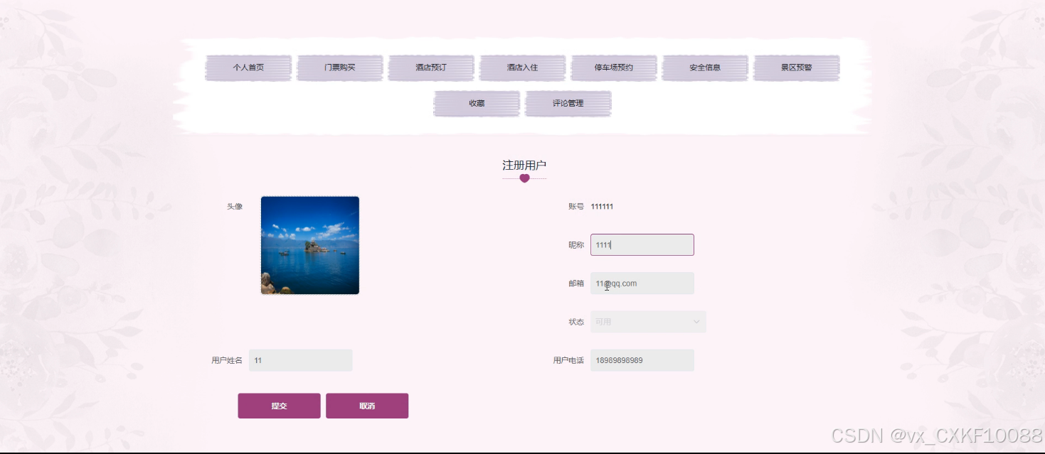 - 个人中心:用户可以访问个人首页,管理门票购买、酒店预订、酒店入住、停车场预约、安全信息、景区预警、收藏和评论管理等个人事务。