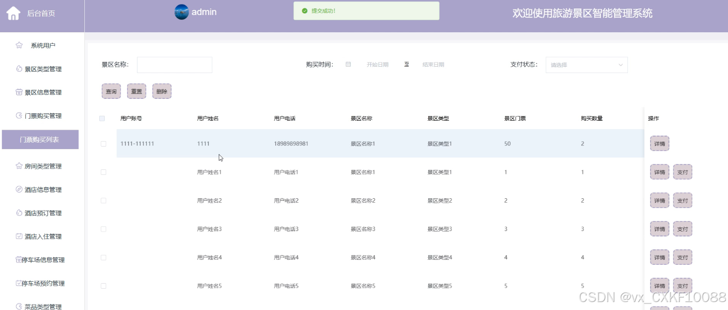 - 门票购买管理:此模块允许管理员查看和管理门票购买记录,包括删除查询、查看订单详情以及处理支付状态,确保门票销售的准确性和及时性。