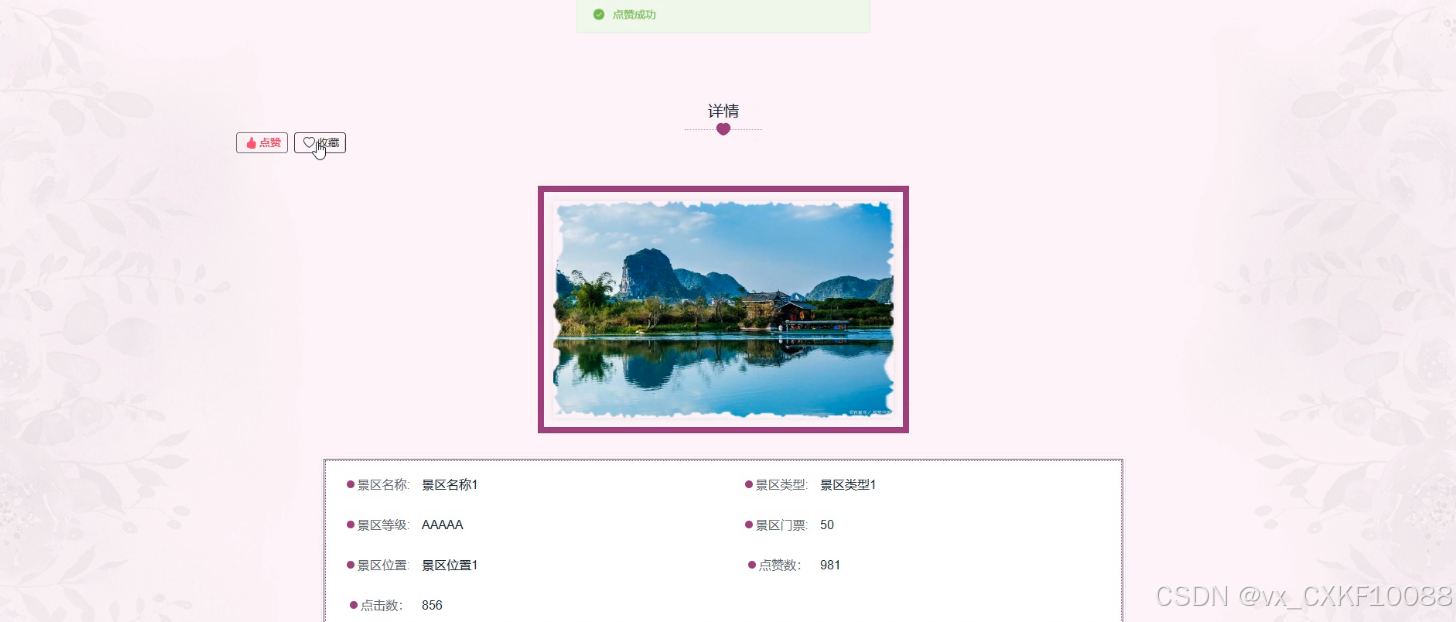 - 景区信息:用户可以浏览不同景区的详细信息,并通过点赞、收藏和评论功能与他人分享自己的体验和建议。