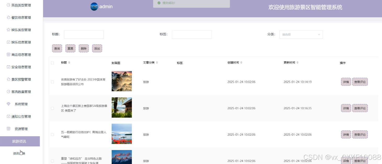 - 资源管理:管理员可以添加、删除和查询旅游资讯信息,以及查看游客对资讯的评论,有助于提供丰富的旅游信息资源。管理员可以添加、删除和查询资讯分类,对旅游资讯进行有效分类,方便用户快速找到感兴趣的内容。
