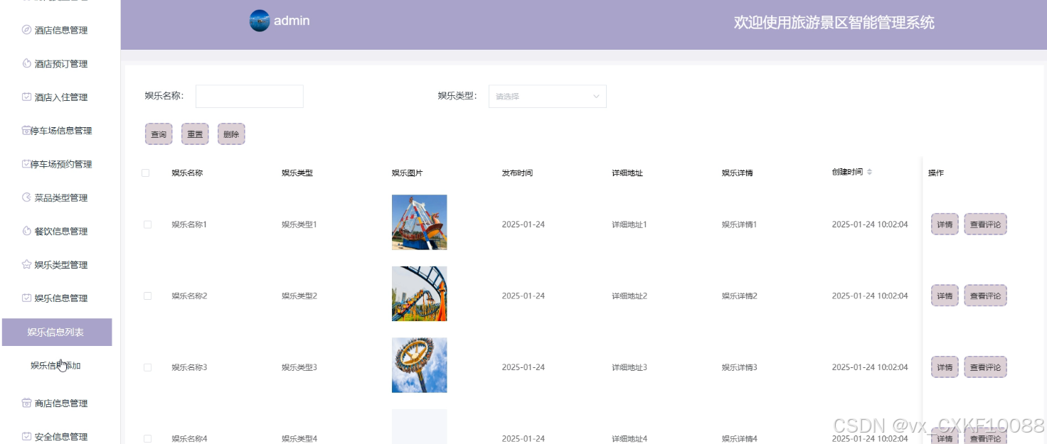 - 娱乐信息管理:管理员可以添加新的娱乐信息,删除或查询现有信息,并查看游客对各个娱乐项目的评论,以便对娱乐信息进行维护和更新。