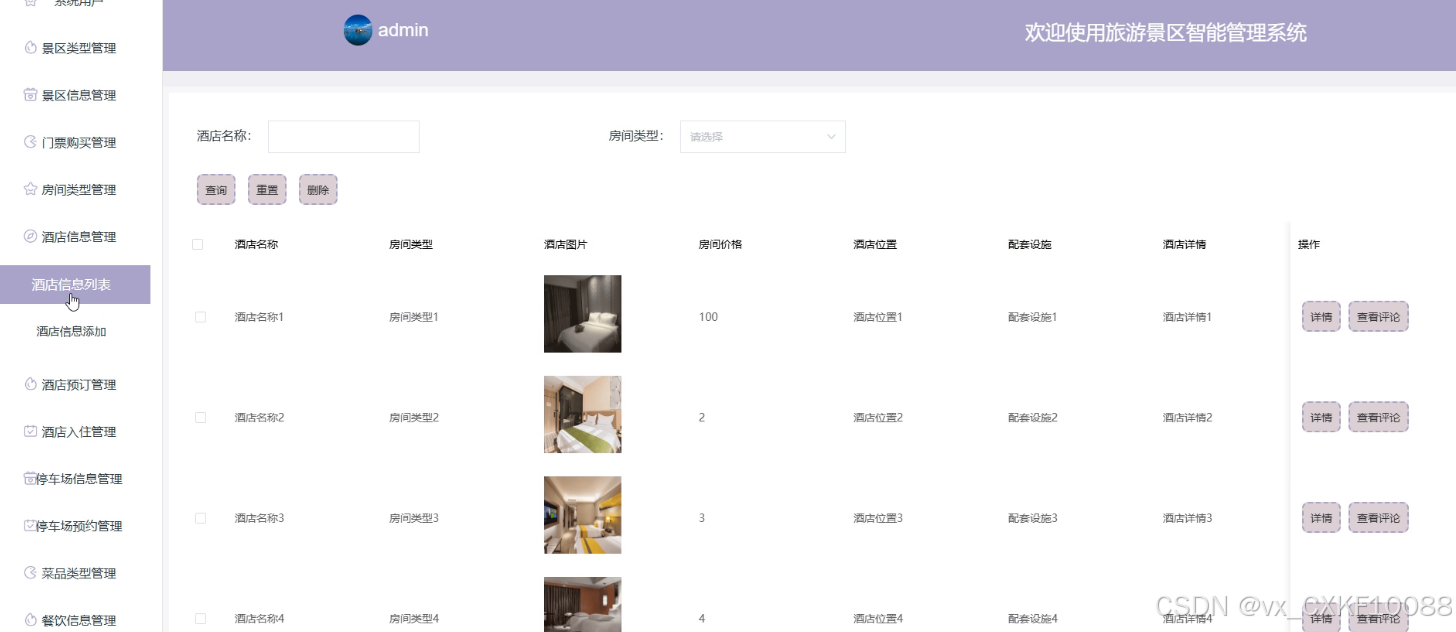 - 酒店信息管理:管理员可以添加新的酒店信息,删除或查询现有信息,并查看游客对各个酒店的评论,以便对酒店信息进行维护和更新。