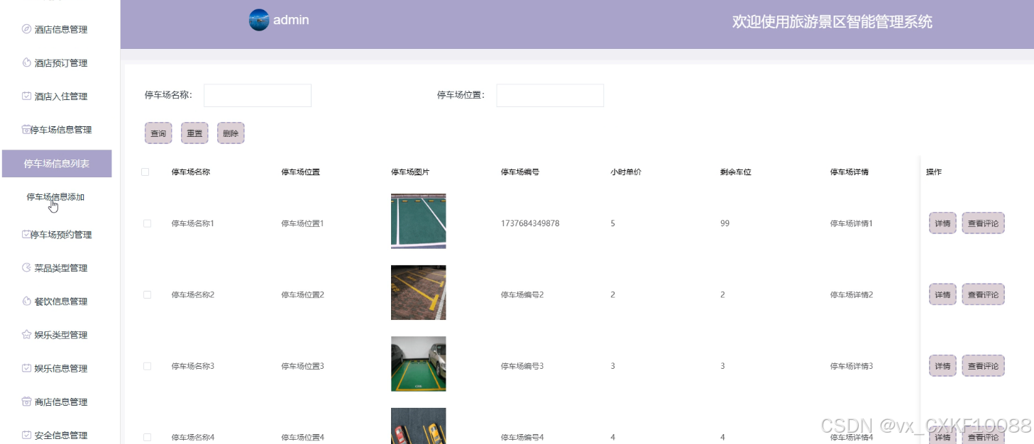 - 停车场信息管理:管理员可以添加、删除和查询停车场信息,以及查看游客对停车场的评论,有助于对停车场资源进行合理分配和管理。