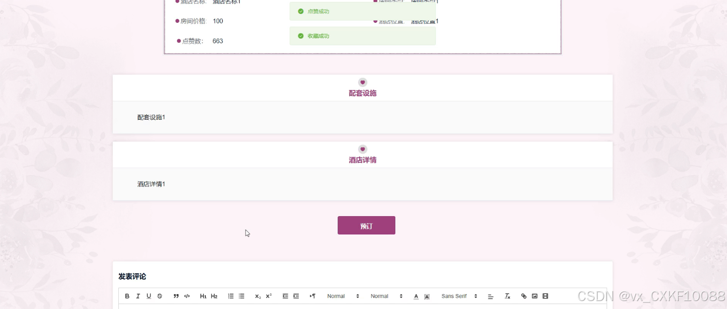 - 酒店信息:用户可以查找和预订酒店,并通过点赞、收藏和评论功能分享住宿体验。