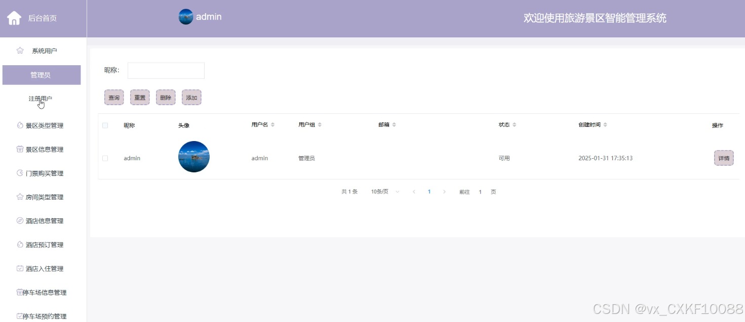 - 景区类型管理:管理员可以在此模块添加、删除和查询不同的景区类型,以及查看每个类型的详细信息,有助于对景区进行分类管理。