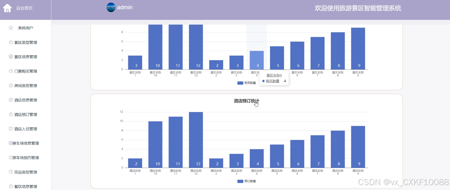 - 后台首页:管理员登录后,首先看到的是后台首页,这里展示了个人信息、修改密码的选项,以及门票购买统计和酒店预订统计的概览,方便管理员快速了解业务情况。