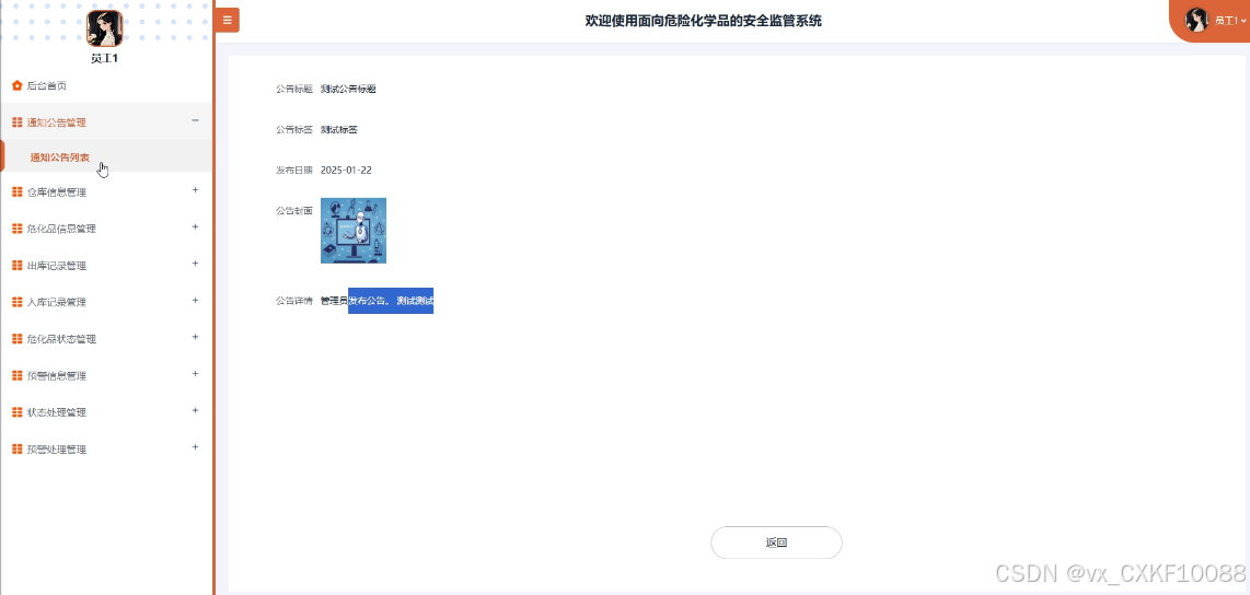 - 通知公告管理:员工用户可搜索和浏览管理员发布的通知公告信息。