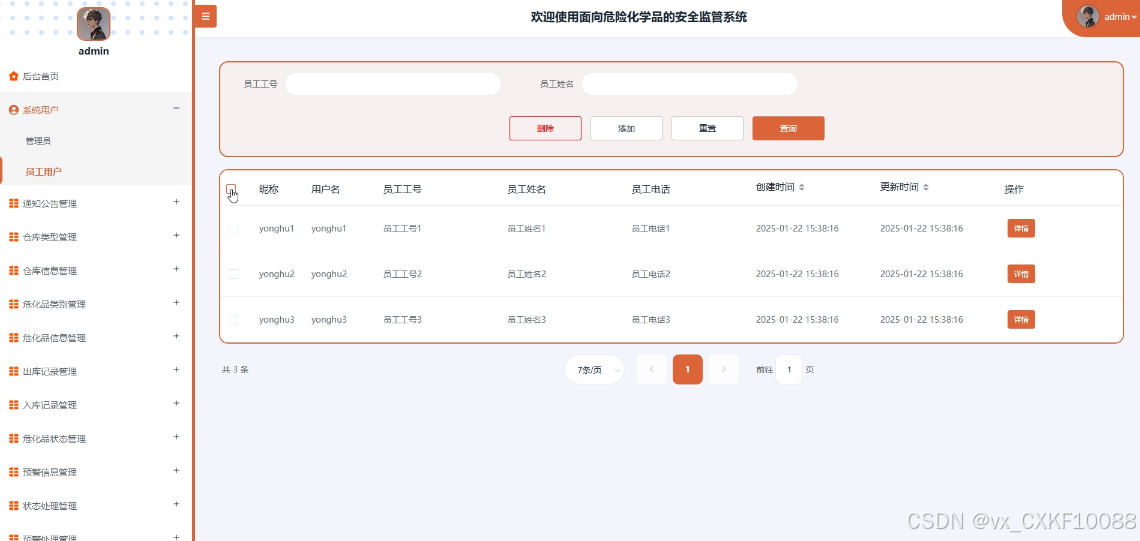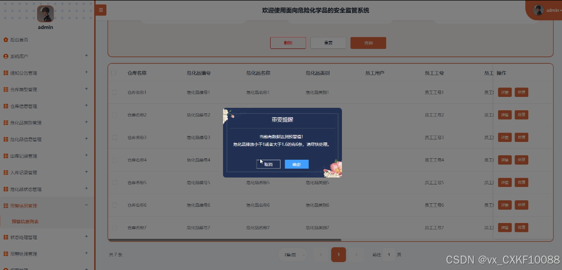 - 预警信息管理:员工用户可搜索和浏览自己的预警信息,实现危化品排放预警提醒。