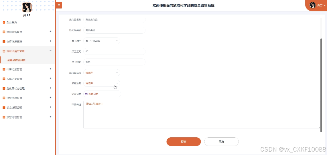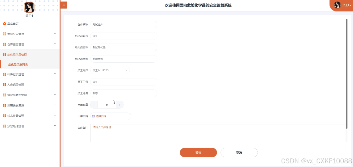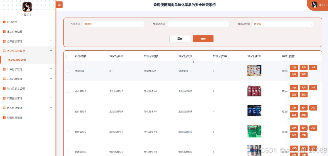 - 危化品信息管理:员工用户可搜索和浏览所有危化品信息,实现出库、入库、监测、预警等功能,负责记录和更新出库、入库、监测和预警等信息。