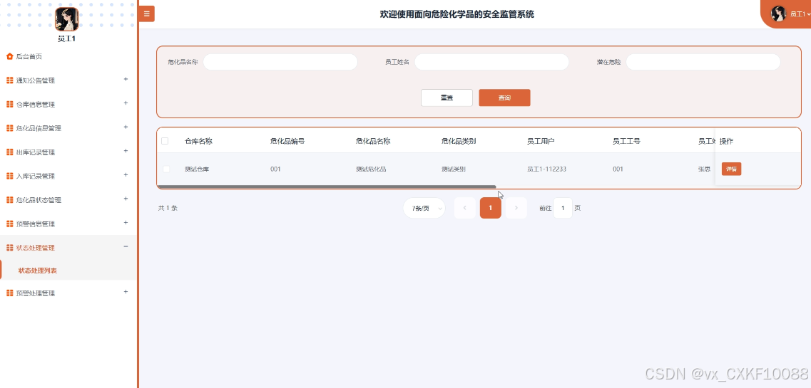 - 危化品状态管理:员工用户可搜索和浏览自己的危化品状态信息。