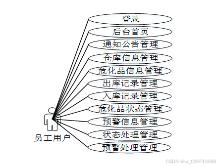 本面向危险化学品的安全监管系统设计分为两个主要用户角色:员工用户和管理员。以下是对每个角色的功能需求的详细描述。